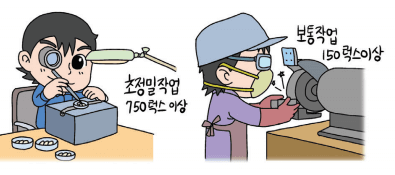 사업주는 근로자가 상시 작업하는 장소의 작업면 조도를 다음 각 호의 기준에 맞도록 하여야 한다. 다만, 갱내 작업장과 감광재료를 취급하는 작업장은 그러하지 아니하다.