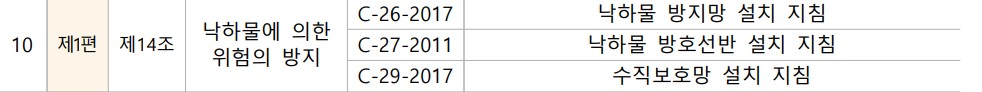 낙하물에 의함 위험의 방지 관련 기술지침은 세가지가 있습니다. 낙하물 방지망 설치 지침, 낙하물 방호선반 설치지침, 수직보호망 설치지침이 있습니다.