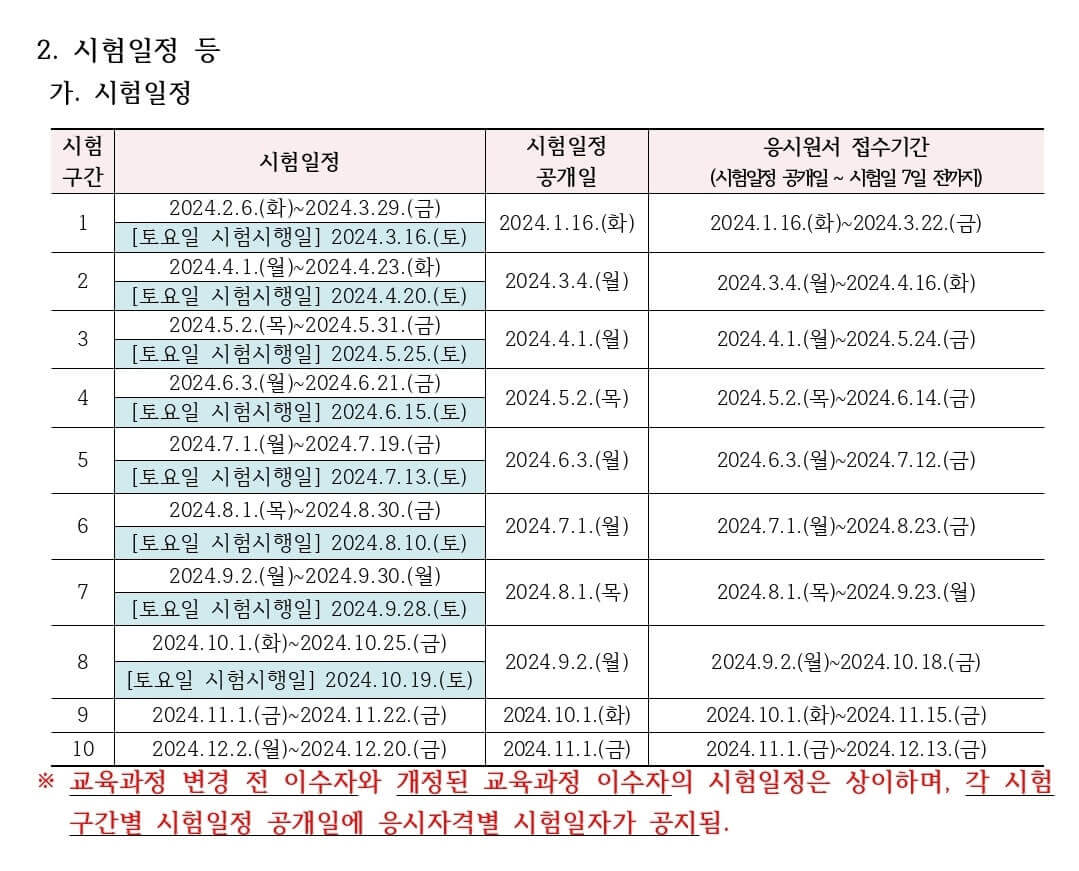 총 10회차 시행되며 구간별 확정 시험일은 시험일정 공개일에 공개됩니다. 응시자격을 갖춘 상태에서는 시험에 언제든 응시할 수 있습니다.